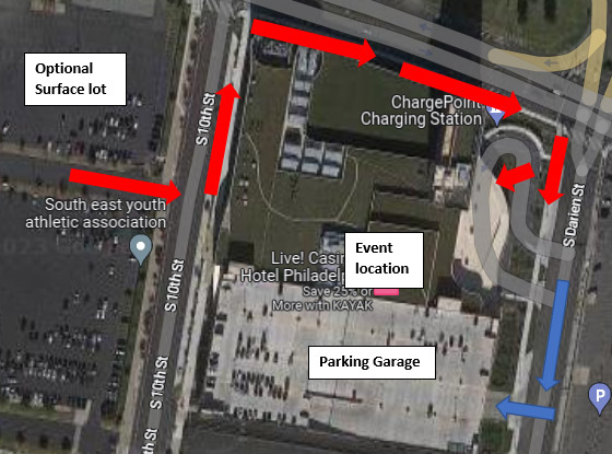 LIVE! Casino & Hotel Philadelphia has complimentary garage parking available through the Darien Street entrance. A surface lot is also available off 10th street. Keep in mind, attendees who park in the surface lot must enter through the casino; no one under the age of 21 is permitted in the casino.